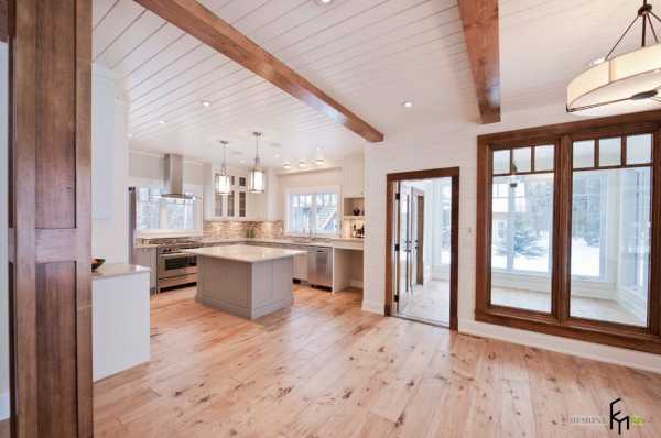 Внутреннее убранство дома также выполнено натуральными материалами. Натуральная доска и ламинат присутствуют в каждой комнате. Сочетание с белой вагонкой делает дом светлее и чище. Из большой прихожей можно сразу попасть на кухню.