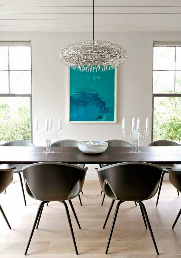 Зона столовой смотрится не менее стильно, здесь стоит большой темный стол, его окружают восемь комфортабельных стульев-кресел, а на нем установлены два модных подсвечника. Над столом подвешена интересная сферовидная проволочная люстра.
