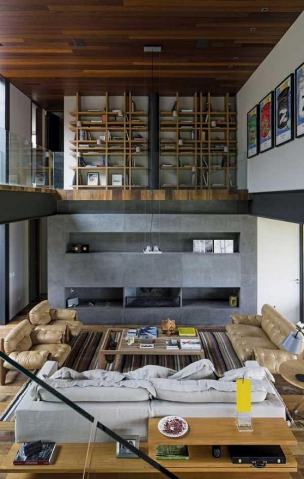 Деревянный потолок и бетонный дизайн стены в гостиной в стиле хай-тек