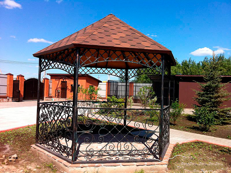 Кованые павильоны с металлочерепичной крышей выглядят гораздо изящнее. Они прекрасно вписываются в ландшафтный дизайн загородных домов. Однако важно следить за тем, чтобы цвет черепицы и ее узор повторял тот, который используется на основном строении. Такое покрытие дает хорошую тень, а также отличается прочностью.