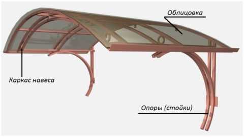 Навес над крыльцом перед домом состоит из двух элементов – каркаса и кровли. По конструкции и способу крепления козырек может быть: