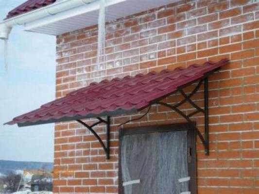 Из металлических материалов для козырьков чаще всего используется металлочерепица или профнастил. В отличие от поликарбоната эти материалы обладают отличной механической прочностью. Никакой град не способен пробить их насквозь. В отдельных вариантах легко образуются вмятины, которые потребуют замены. Металлические листы устойчивы к перепадам температур, поэтому могут использоваться даже в лютые морозы. Есть некоторые ограничения на полукруглые формы козырьков, поэтому чаще всего с использованием профнастила и металлочерепицы сооружаются конструкции односкатные и двускатные.