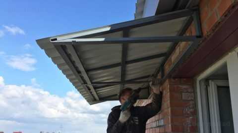 После монтажа основы навеса, выполняется укладка кровельного настила. Если речь идет о поликарбонате, тогда необходимо следить, чтобы не затянуть саморезы сильно, что приведет к повреждению материала. Профнастил и металлочерепица крепятся к основе с помощью специальных саморезов с резиновыми уплотнителями. Тыльная часть дополнительно закрепляется к стене фасада, что будет залогом дополнительной прочности. Видео о сооружении конструкции навеса можно посмотреть ниже.
