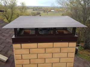 - На дымоотводные блоки, сложенные из кирпича и снабженные боковыми продухами, очень желательно монтировать двускатные либо вальмовые колпаки. Цель – закрыть от осадков и ветра верхнюю часть кладки, не касаясь газоходных отверстий по бокам.