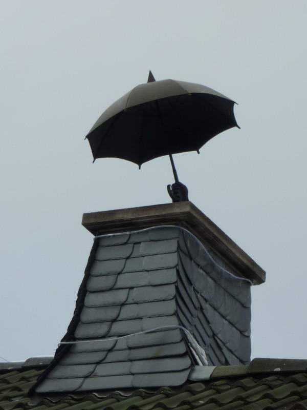 - Защитный зонтик. Навершие колпака в виде конуса, пирамиды, полукруга или других, более сложные форм. Зонт защищает трубу от попадания в нее атмосферных осадков, мусора, проникновения в дымоход птиц.