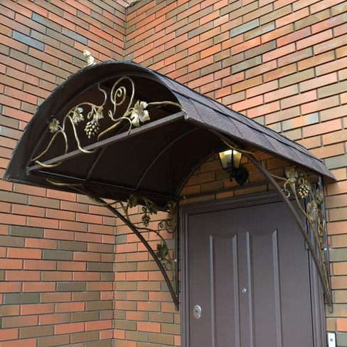 Универсальный вариант – металлические конструкции с элементами художественной ковки. Этот вид козырьков не утратит эксплуатационные свойства и привлекательный вид даже через несколько лет.