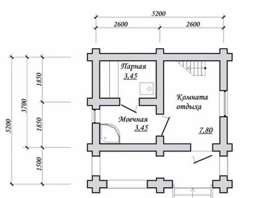 Такой вариант небольшой и рассчитан на 1-2 человек. Преимуществами подобного проекта являются низкая стоимость и компактность. Несмотря на такие небольшие размеры в бане будут иметься все необходимые помещения: парная, моечная и предбанник.