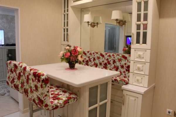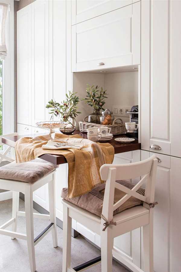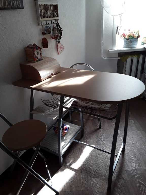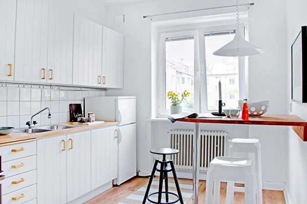 - Небольшой размер кухни не позволяет вместить полноразмерный стол, который будет мешать свободно перемещаться в пределах помещения;