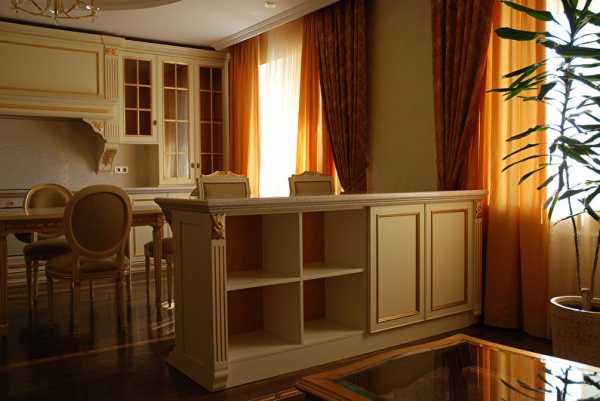 В кухне гостиной самое место для массивной конструкции. Следует знать, что нельзя устанавливать многоуровневую стойку, если в комнате невысокие потолки: в противном случае, визуально они еще больше опустятся.
