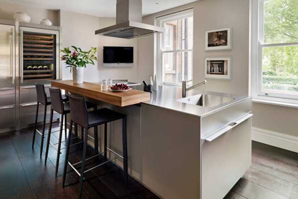 Хорошее решение сразу нескольких вопросов даст установка элегантной барной стойки, которая может быть даже соединена с рабочей поверхностью. Высота ее будет в этом случае ниже метра.