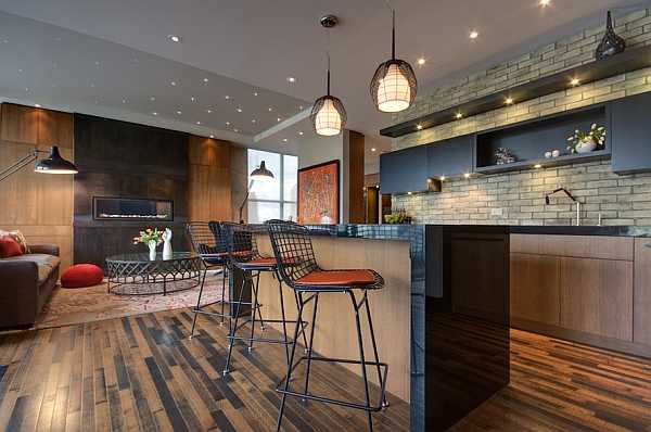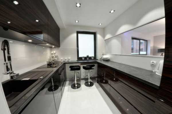 Зону барной стойки зачастую снабжают дополнительной подсветкой. Даже если она является лишь продолжением кухонного гарнитура, точечные светильники существенно облегчат процесс готовки.