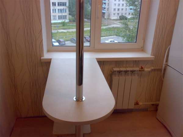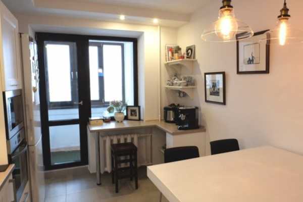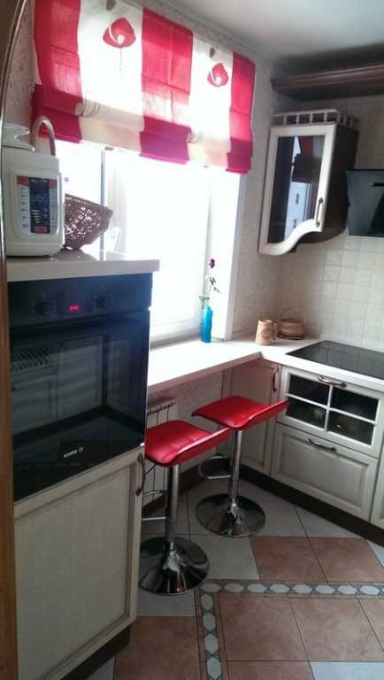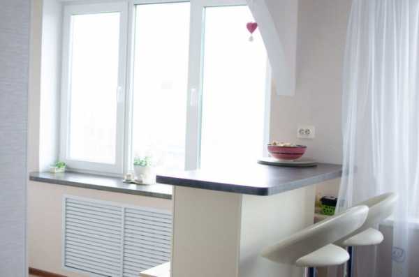 - Совмещение барной стойки с подоконником. Используется в маленьких кухнях или после перепланировок с присоединением балкона. В последнем случае барная стойка устанавливается в оконный блок на место подоконника.