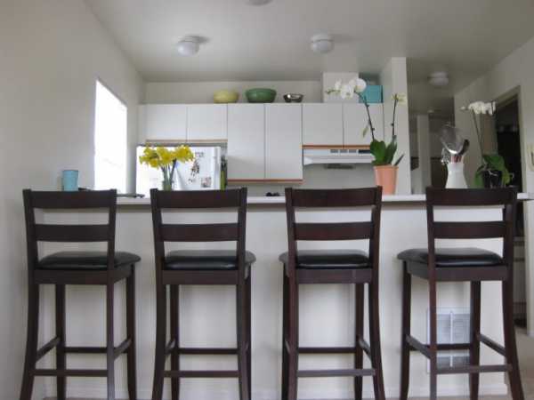 Чтобы сидеть за стойкой было удобно, стулья подбирают по ее высоте. Стандартом считается 60 см.