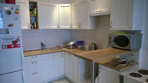 - Встроенная барная стойка. Приобретается кухонный гарнитур как правило угловой Г или П образный, у которого одна грань не имеет нижних шкафов либо они укорочены. Самый простой в реализации и недорогой вариант.