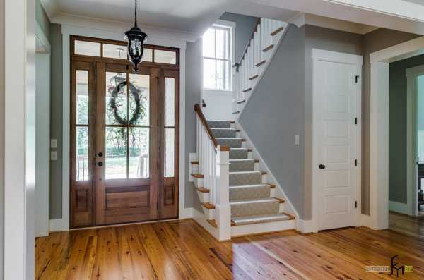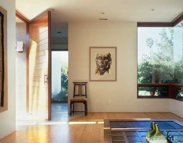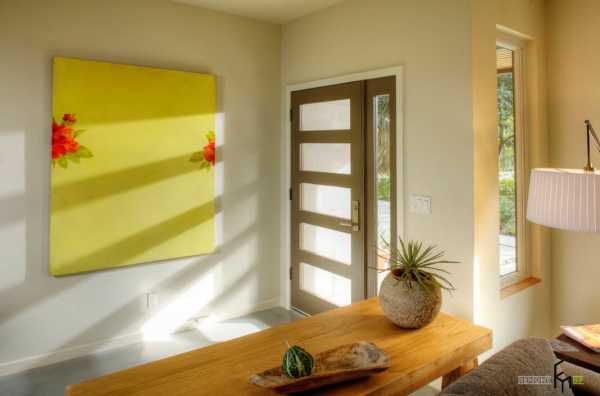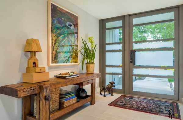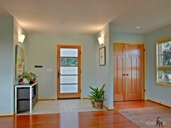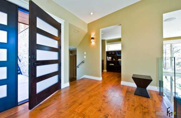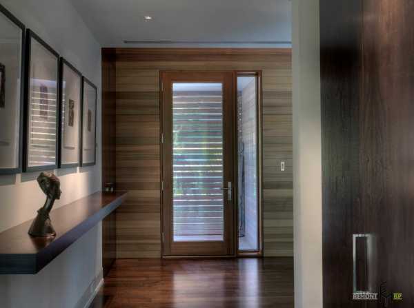 Расположение глухой деревянной двери в створе прозрачных вставок – интересный дизайнерский прием, наличие стекла и в верхней части дверного проему увеличивает солнечный поток, который сможет попасть во внутреннее помещение.