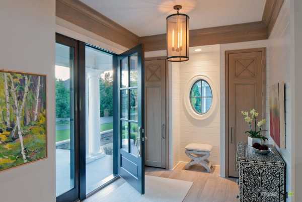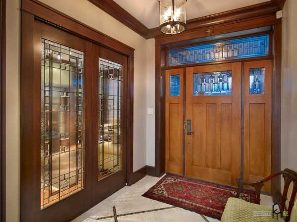 Даже небольшие стеклянные вставки способны осветить помещение прихожей и разбавить глухой вид достаточно крупных двустворчатых дверей.