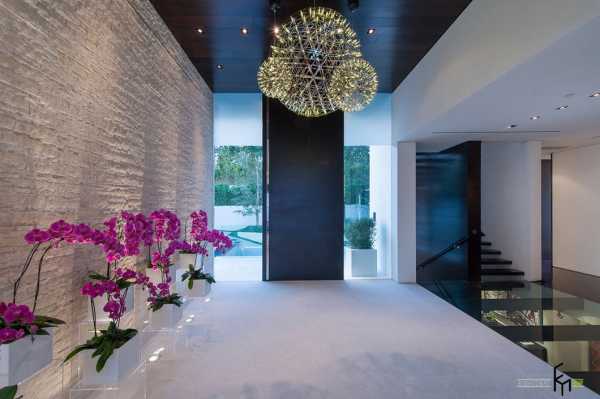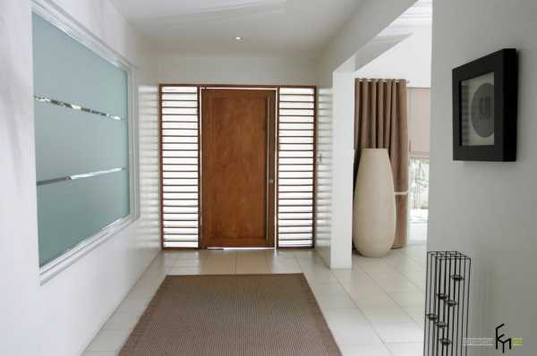 Огромный дверной проем этого частного дома был дизайнерски оформлен с помощью прозрачного стекла, дерева и пластика. Контраст в принятых геометрических и цветовых приемах, позволил создать нетривиальную модель с интересным образом.