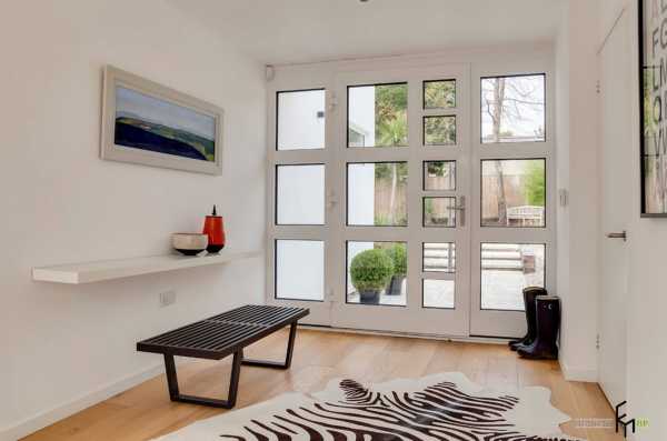 Интересный дизайн пластиковой белоснежной двери, разделенной на множество стеклянных секций, прекрасно подходит для современного домовладения, выполненного в стиле минимализм или близкого по духу к этому стилевому течению.
