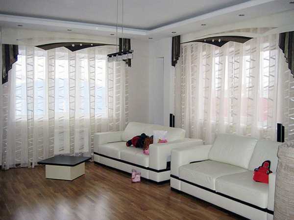 Не редко случается так, что хозяева квартир или домов не знают, как подойти к оформлению гостиной, если в ней два окна. Главное правило, в данном случае, звучит очень просто: два окна как братья близнецы. Пренебрегать этим правилом категорически запрещено. Необходимо следить за тем, чтобы узоры на шторах обязательно совпадали.