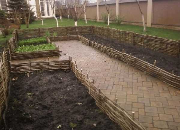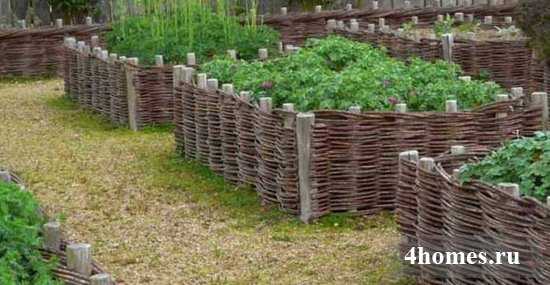 Грядки для зелени, оформленные плетнями по периметру.