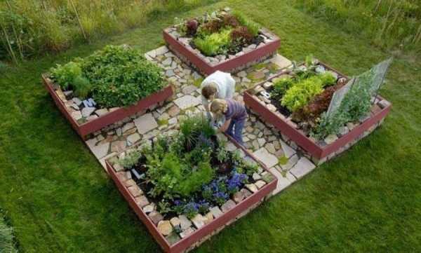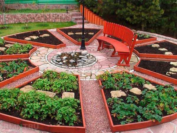 Грядки, оформленные в геометрических фигурах.