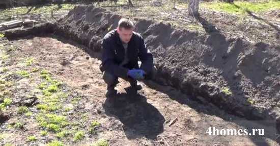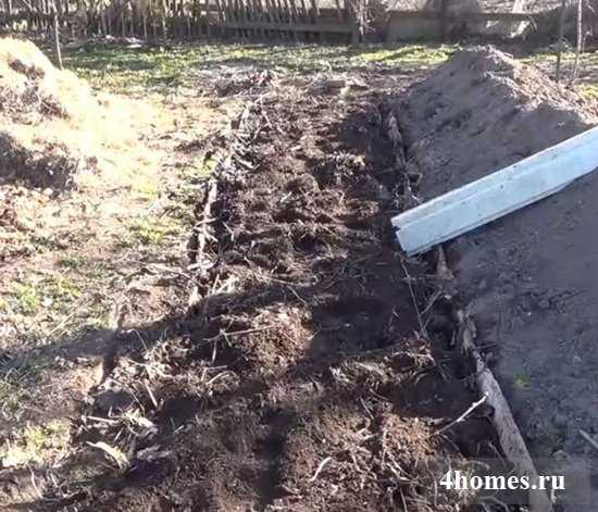 Выкопайте траншею шириной 1–1,2 м и глубиной в штык лопаты – 20–30 см. Длина зависит от габаритов участка. Можно сделать 3, 6 и более метров.