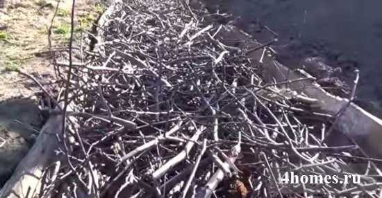 Продолжаем устилать дно. Раскладываем ветки, например, оставшиеся после обрезки сада.