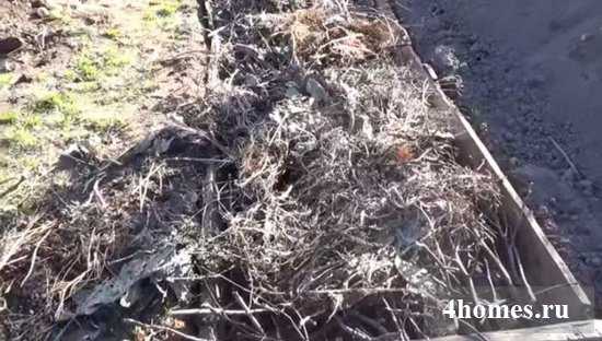 Укладываем толстый слой компоста или остатки бытовых отходов: скошенной травы, стеблей от кукурузы, листвы.