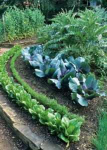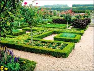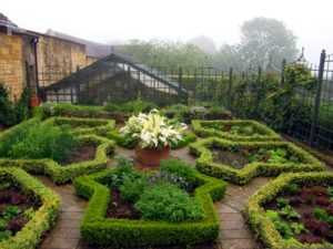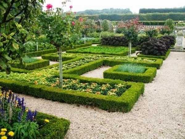 Между ними прокладывают каменные или кирпичные дорожки. А границы каждой грядки обязательно обозначают бордюром или заборчиком. Выбирая культуры для высаживания на таких грядках, руководствуются схожими условиями для их выращивания. Рекомендуются к посадке капуста, морковь, свёкла, зелень (петрушка, укроп, салат, щавель, хрен), земляника или клубника. Не стоит высаживать плетущиеся культуры, которые будут разрастаться и нарушать гармонию грядок.