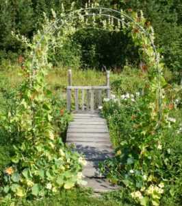 Из плетущихся овощных культур (огурцы, кабачки) можно сделать декоративную арку, подготовив соответствующий каркас, на который по мере роста растений подвязываются их стебли и направляются усы.