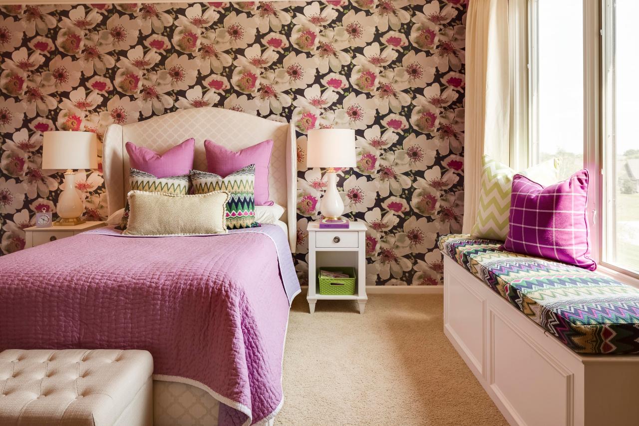 Контраст цветов и фактур может увеличить пространство маленькой комнаты. Отделка одной из стен яркими обоями, зрительно притягивает ее.