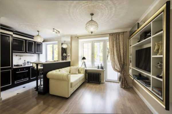 Другой вариант – это объединение кухни и гостиной комнаты. Так часто делают, но нужно согласовать с мастерами возможно ли такое для вашей квартиры. Если это не несущая стена и её можно снести – смело объединяйте эти два помещения. Тогда будет не только современно и красиво, но и достаточно практично.