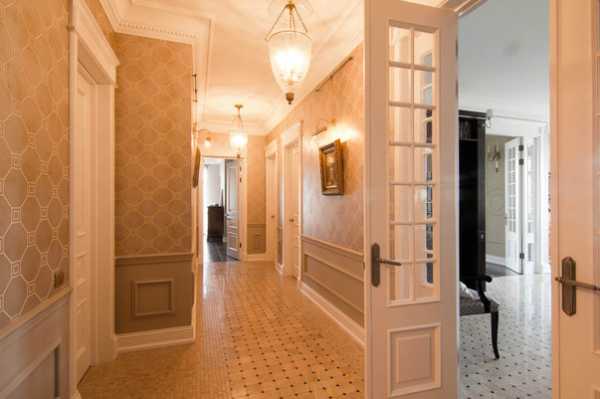 Длинный глухой коридор, объединяющий анфиладу комнат, как будто скопирован с исторического интерьера. Так могли выглядеть в прошлой жизни питерские коммуналки. Бежевые панели в тон обоям, высокий лепной карниз на потолке, роскошные парные люстры, свисающие с потолка, живопись на стенах — все эти детали воссоздают обаяние неоклассики. Именно так выглядели очень красивые квартиры сто лет назад. Белые филенчатые двери с решетчатым остеклением и высокий плинтус – тоже буквальная классическая цитата.