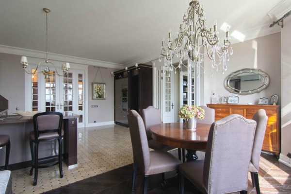 Кухня-столовая в сиреневых тонах оправдывает обещания прихожей. Особенно хороши стулья с заклепками на спинках и четырехстворчатые двери. Кухня сто лет назад не была публичным местом, поэтому здесь дизайнер додумывает элементы. Появляется барная стойка с каменной столешницей и опорной полуколонной в духе ар-деко, барные стулья с гнутыми ножками. Для бытовой техники выделен специальный шкаф в углу. Чтобы компенсировать нехарактерные металлические фасады, шкаф украсили классическими бра в том же дизайне, что и роскошная люстра.