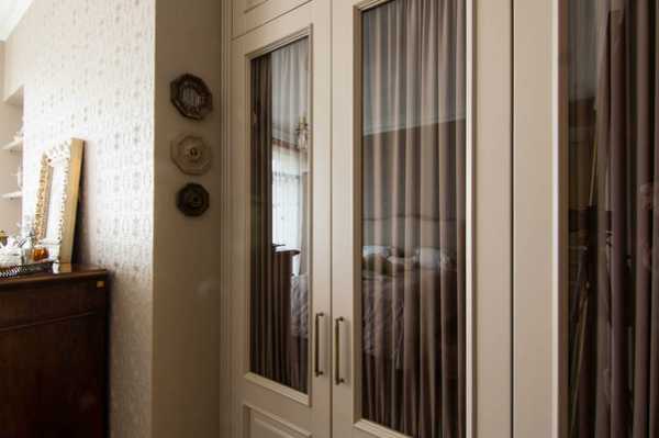 Встроенный платяной шкаф заслуживает отдельного внимания. Никаким современным дверцам на роликах, конечно, было не место в этом интерьере. Достоверные филенчатые дверцы со стеклянными вставками затянуты изнутри присборенными шторками – точно такой декор использовался сто лет назад и для межкомнатных дверей и для дверец небольших шкафчиков.