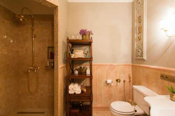 В ванной отказались от стандартной душевой кабины – она выглядела бы слишком современной. Вместо нее — ниша, выложенная плиткой. Душ с огромной лейкой и латунная сантехническая арматура тоже выдержаны в нужной стилистике. Для мелочей приспособлена деревянная этажерка.