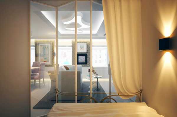 Маленькая спальня отделена от гостиной прозрачной перегородкой и и дополнена красиво задрапированной портьерой. Дизайн и планировка вашей квартиры могут меняться со временем – так и этим молодым супругам придется подумать о более надежной двери, когда появятся дети, а пока спальня за стеклом настраивает на романтический лад.
