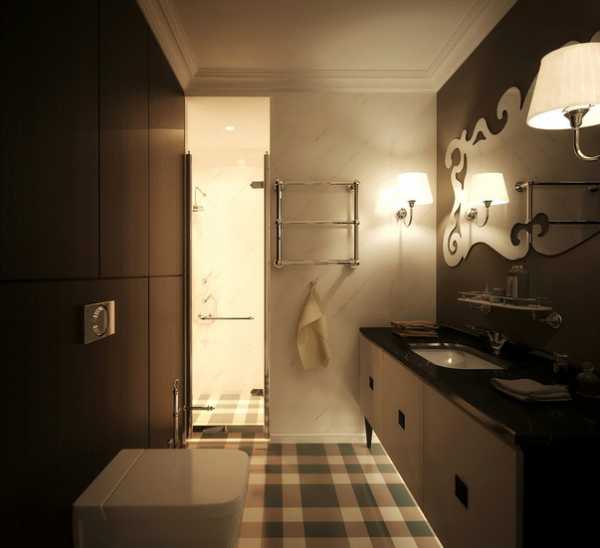 Несимметричное зеркало на стене ванной своими округлыми очертаниями напоминает люстру на потолке гостиной. Мебель для ванной в данном случае – действительно мебель в полном смысле этого слова, превращающая банальный «санузел» в изысканную ванную комнату.
