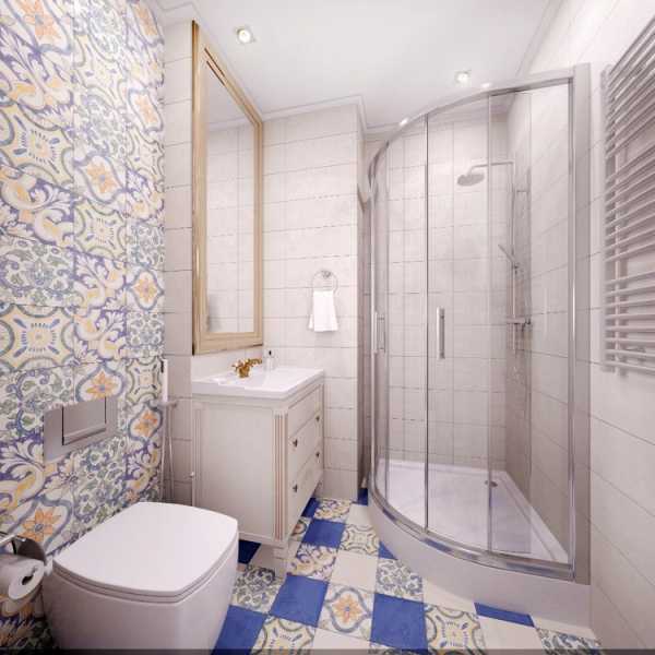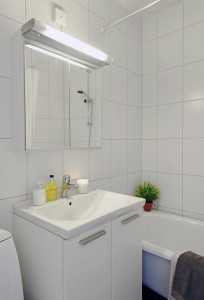 Ванная. Для создания домашнего уюта одну из стен ванной покрыли плиткой с рисунком, напоминающим узоры на обоях. Это слегка «расцветило» безликую белизну сантехнического помещения.