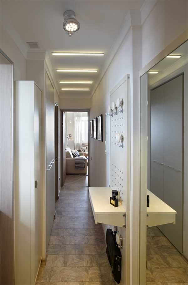 Светлые отделочные материалы и большое зеркало помогли расширить прихожую. Светящиеся «полосы» светильников подчёркивают движение в глубину. Слева — небольшой плоский шкаф для мелочей и частично встроенный платяной. Справа — оригинальная вешалка: перфорированная панель со съёмными крючками и консольной полкой.