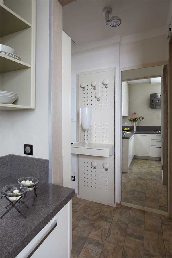 Между кухней и прихожей проход оставлен открытым, а напротив него к стене у входной двери прикрепили высокое зеркало. Вместо обычного фартука над кухонной столешницей — высокий бортик.