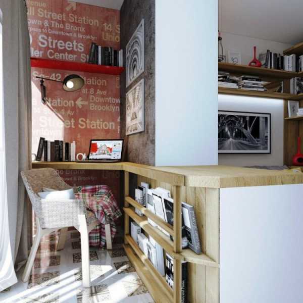 При площади 18 кв. м. необходимо экономить каждый сантиметр и использовать все возможности для того, чтобы увеличить маленькое пространство. С этой целью дизайнеры утеплили лоджию и объединили ее с жилой комнатой – для этого пришлось убрать балконный блок. На бывшей лоджии оборудовали кабинет для работы с угловой столешницей и открытыми полками для книг.