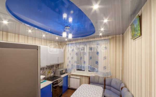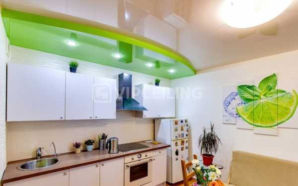 Для маленькой кухни подойдет потолок комбинированный. На матовой поверхности используют глянцевые вставки, которые увеличивают объем помещения.