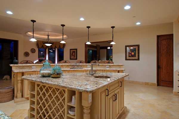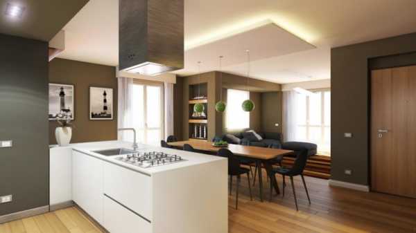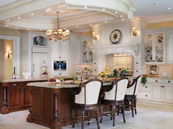 Отличаются благородностью, набором различных материалов, фактур и форм. Вариантов двухуровневых масса, все зависит от фантазии дизайнера, вкусов и финансов заказчика. Этот метод позволяет изолировать кухонную зону, создать неповторимый декор.