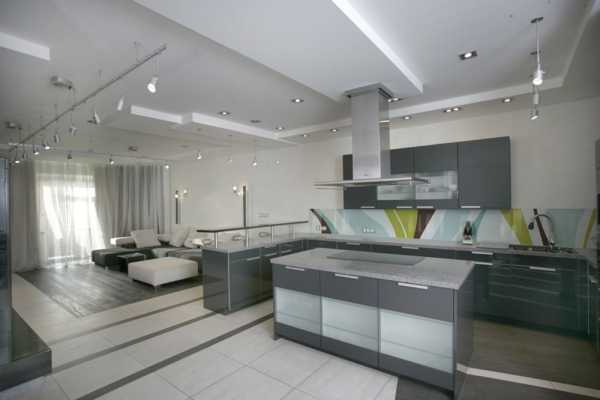 Красивые интерьеры квартир: фото кухни, совмещенной с гостиной, фотоВторой способ предполагает создание двух уровней напольного покрытия. Как правило, более высоким делается уровень пола в кухонной зоне.