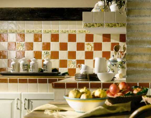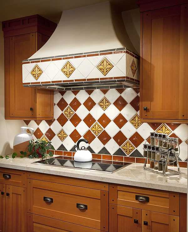 На фото представлен вариант фартука из керамической плитки с декоративными вставками и бордюрами.