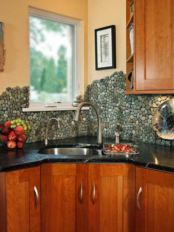 Речная галька довольно часто применяется для отделки ванных комнат, но неужели в кухне она будет выглядеть хуже? Наш ответ: конечно же, нет!