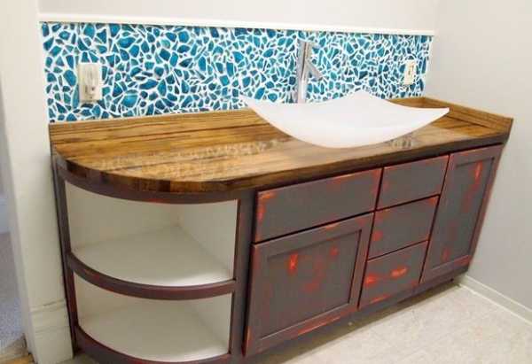 Вторичное использование материалов набирает все большую популярность в дизайне интерьеров по всему миру. Бетон, смешанный с битым стеклом, давно применяется в качестве столешниц, так почему бы не использовать этот экологичный и чрезвычайно прочный материал как фартук для кухни?