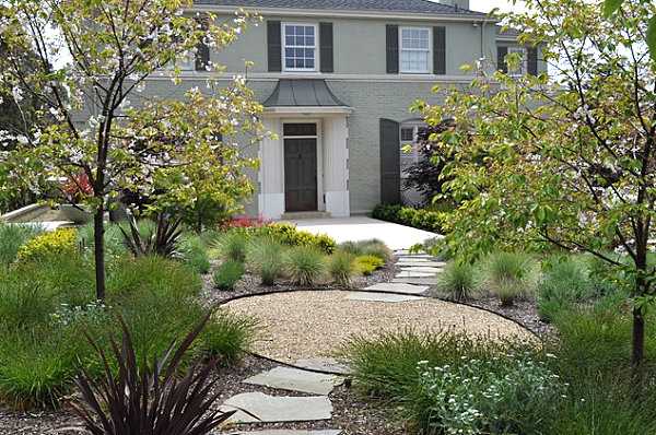 Начнём мы именно с него. Нет ничего лучше, чем доехать до дверей дома через двор, который притягивает внимание. Например, как на фото ниже, где продемонстрировано разнообразие цветов и текстур. (Cipriano Landscape Design)