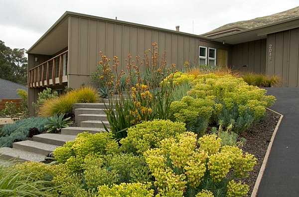 Не обманывайте себя – многие из красивых естественных ландшафтных дизайнов дворов требуют немного работы и планирования. Зелёные насаждения на участке растут обильно, а отсутствие ухоженности не означает, что благоустройство не играет никакой роли: за ними нужно присматривать. Передний двор на картинке под текстом заполнен, как видите, жёлтыми и зелёными. (Jeffrey Gordon Smith Landscape Architecture)